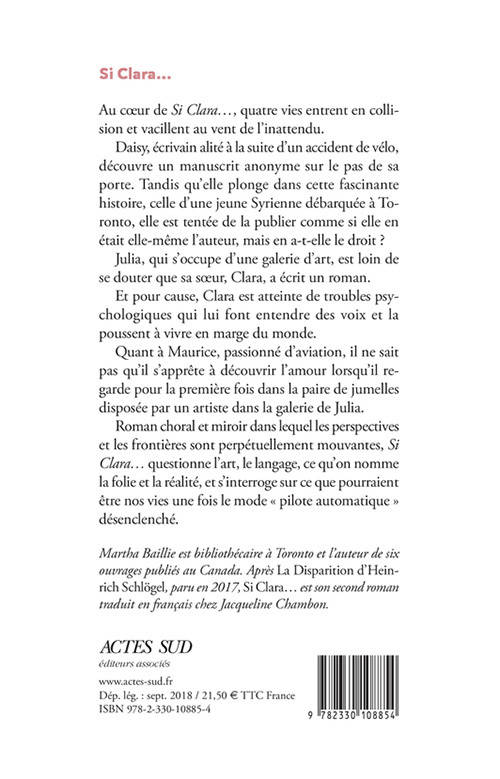Roman choral et miroir dans lequel les perspectives et les frontières sont perpétuellement mouvantes, «Si Clara... »questionne l'art, le langage, ce qu'on nomme la folie et la réalité, et s'interroge sur ce que pourraient être nos vies une fois le mode « pilote automatique » désenclenché.