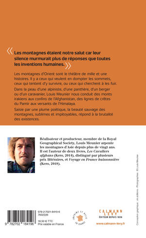 Dans la peau d’une alpiniste, d’une panthère, d’un berger ou d’un caravanier, Louis Meunier nous conduit des monts irakiens aux confins de l’Afghanistan, des lignes de crêtes du Pamir aux versants de l’Himalaya.