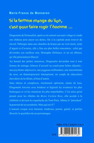 Dragonette de Sermoafort, après avoir enterré son mari volage et vendu son château pour payer ses dettes, file à la capitale pour trouver du travail. Hébergée dans une chambre de bonne par un vieil oncle, riche d'argent et d'avarice, elle y fera ses plus belles rencontres : celui qui deviendra son meilleur ami, Mustapha Defrance, et un rat albinos, qu'elle prénommera Marcel. Au hasard des petites annonces, Dragonette deviendra tour à tour femme de ménage, hôtesse d'accueil ou coach pour bobos déjantés : une psychiatre dépressive, une joggeuse milliardaire, une intermittente du sexe, un thanatopracteur intempérant, un couple de charcutiers chevaliers de la rillette, et bien d'autres. Sans tabous ni complexes, résolument optimiste, aimée de tous, Dragonette traverse avec bonheur et légèreté les aventures les plus burlesques et vit les situations les plus improbables. C'est ainsi qu'en posant pour les rillettes du Brave Cochon Rose, elle accède à la célébrité et devient la coqueluche du Tout-Paris. Même le président la poursuit de ses assiduités. Mais qui est-il ? L'auteure croque avec humour, tendresse, poésie, gaieté, et parfois férocité, le quotidien de ses personnages.