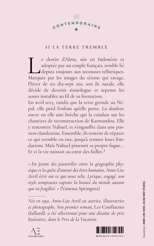 Le destin d'Alma, née en Indonésie et adoptée par un couple français, semble lié depuis toujours aux secousses telluriques. Marquée par les images du séisme qui ravage, l'hiver de ses dix-sept ans, son île natale, elle décide de devenir sismologue et arpente les zones instables au fil de sa formation. En avril 2015, tandis que la terre gronde au Népal, elle perd l'enfant qu'elle porte. La douleur ouvre en elle une brèche qui la conduit sur les chantiers de reconstruction de Katmandou. Elle y rencontre Nahuel, et s'engouffre dans une passion clandestine. Ensemble, ils tentent de réparer ce qui tremble en eux, jusqu'à remuer leurs fondations. Mais Nahuel poursuit sa propre fugue... Et si la vie naissait au coeur des failles ?