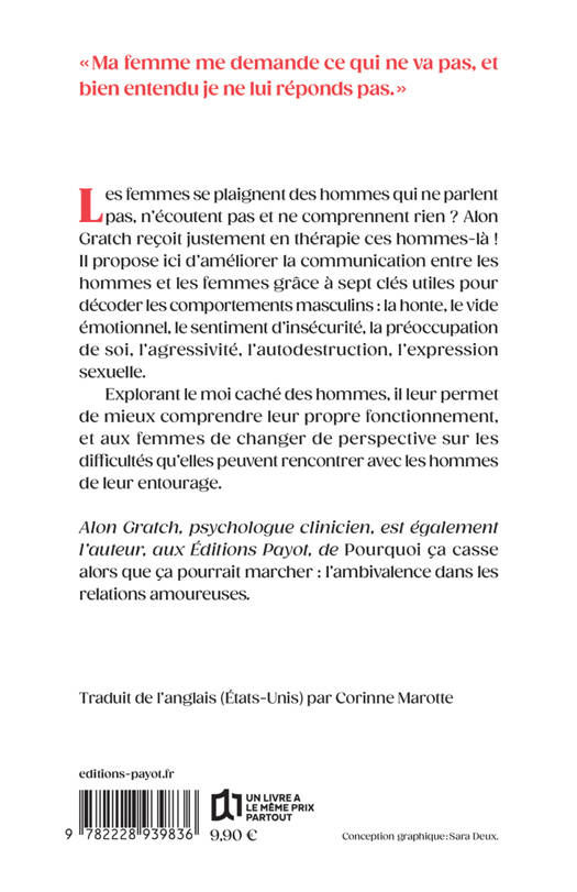 Les femmes se plaignent des hommes qui ne parlent pas, n'écoutent pas et ne comprennent rien ? Alon Gratch reçoit justement en thérapie ces hommes-là ! Il propose ici d'améliorer la communication entre les hommes et les femmes grâce à sept clés utiles pour décoder les comportements masculins : la honte, le vide émotionnel, le sentiment d'insécurité, la préoccupation de soi, l'agressivité, l'autodestruction, l'expression sexuelle. Explorant le moi caché des hommes, il leur permet de mieux comprendre leur propre fonctionnement, et aux femmes de changer de perspective sur les difficultés qu'elles peuvent rencontrer avec les hommes de leur entourage.