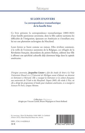Ce livre présente la correspondance transatlantique (1803-1821) d'une famille patricienne anversoise, dont la fille cadette surmonta les difficultés de l'émigration, épousant un Américain et s'installant avec lui sur une plantation esclavagiste du Maryland. Leurs lettres se lisent comme un roman. Elles révèlent comment, à la veille de l'existence autonome de la Belgique, ces réfugiés de la Révolution française, descendants du peintre Rubens, aidèrent leur fille à affirmer une spécificité culturelle déjà clairement belge dans la capitale américaine.