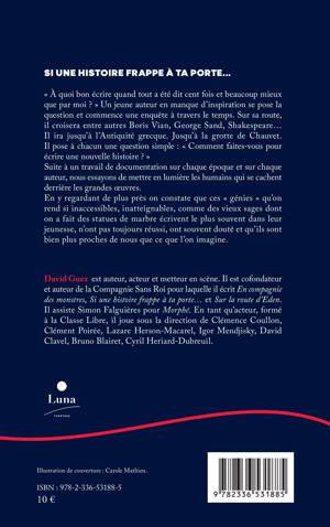 À quoi bon écrire quand tout a été dit cent fois et beaucoup mieux que par moi ? Un jeune auteur en manque d'inspiration se pose la question et commence une enquête à travers le temps. Sur sa route, il croisera entre autres Boris Vian, George Sand, Shakespeare... Il ira jusqu'à l'Antiquité grecque. Jusqu'à la grotte de Chauvet. pose à chacun une question simple: Comment faites-vous pour écrire une nouvelle histoire ? Suite à un travail de documentation sur chaque époque et sur chaque auteur, nous essayons de mettre en lumière les humains qui se cachent derrière les grandes oeuvres. En y regardant de plus près on constate que ces génies qu'on rend si inaccessibles, inatteignables, comme des vieux sages dont on a fait des statues de marbre écrivent le plus souvent dans leur jeunesse, n'ont pas toujours réussi, ont souvent douté et qu'ils sont bien plus proches de nous que ce que l'on imagine.