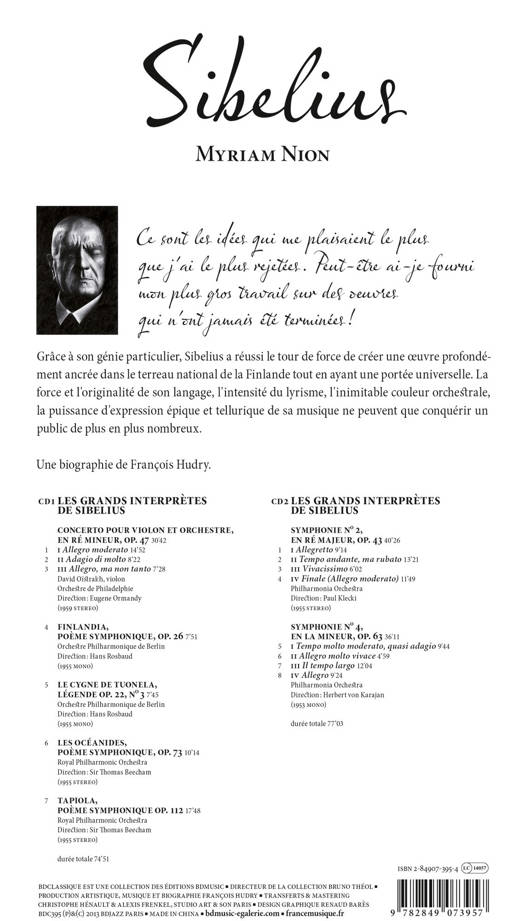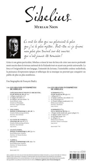 Une biographie de Sibelius, écrite par François Hudry, illustrée par Myriam Nion, accompagnée de 2 compact discs .<br /> Personne ne doit penser que créer soit plus facile pour un compositeur âgé s'il croit sérieusement à son art. <br /> Les scrupules croissent avec les années. On est continuellement en proie à de nouveaux problèmes.<br /> Ce sont les idées qui me plaisaient le plus que j'ai le plus rejetées. <br /> Peut-être ai-je fourni mon plus gros travail sur des oeuvres qui n'ont jamais été terminées ! <br /> Sibelius (1935)<br /><br /> Grâce à son génie particulier, Sibelius a réussi le tour de force de créer une oeuvre profondément ancrée dans le terreau national de la Finlande tout en ayant une portée universelle. La force et l'originalité de son langage, l'intensité du lyrisme, l'inimitable couleur orchestrale, la puissance d'expression épique et tellurique de sa musique ne peuvent que conquérir un public de plus en plus nombreux.<br /><br /><br /> CD 1 ~ Les Grands Interprètes de Sibelius <br /> Concerto pour violon et orchestre, en ré mineur, op. 47 <br /> 1 I. Allegro moderato 14’52<br /> 2 II. Adagio di molto 8’22<br /> 3 III. Allegro, ma non tanto 7’28<br /> David Oïstrakh, violon<br /> Orchestre de Philadelphie : Eugene Ormandy<br /> 4 Finlandia, poème symphonique, op. 26 <br /> Orchestre Philharmonique de Berlin<br /> Direction : Hans Rosbaud <br /> 5 Le Cygne de Tuonela, légende op. 22, N° 3 <br /> Orchestre Philharmonique de Berlin<br /> Direction : Hans Rosbaud <br /> 6 Les Océanides, poème symphonique, op. 73 <br /> Royal Philharmonic Orchestra <br /> Direction : Sir Thomas Beecham <br /> 7 Tapiola, poème symphonique op. 112 <br /> Royal Philharmonic Orchestra <br /> Direction : Sir Thomas Beecham <br /><br /> CD 2 ~Les Grands Interprètes de Sibelius<br /> Symphonie no 2, en ré majeur, op. 43 <br /> 1 I. Allegretto <br /> 2 II. Tempo andante, ma rubato <br /> 3 III. Vivacissimo <br /> 4 IV. Finale (Allegro moderato) <br /> Philharmonia Orchestra, Direction : Paul Klecki<br /> Symphonie no 4, en la mineur, op. 63 <br /> 5 I. Tempo molto moderato, quasi adagio <br /> 6 II. Allegro molto vivace <br /> 7 III. Il tempo largo <br /> 8 IV. Allegro <br /> Philharmonia Orchestra, Direction : Herbert von Karajan<br /><br />