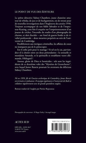 Le prêtre détective Sidney Chambers, jeune chanoine amateur de whisky, de jazz et de backgammon, est de retour pour de nouvelles investigations dans l'Angleterre des années 1950. Toujours accompagné de son fidèle labrador et de l'inspecteur Keating, cette fois il enquête sur l'empoisonnement d'un joueur de cricket, l'incendie du studio d'un photographe de charme, et doit élucider - sur fond de guerre froide et de rivalité professorale - deux meurtres perpétrés au sein de l'université de Cambridge. Parallèlement aux intrigues criminelles, les affaires de coeur ne manquent pas de le préoccuper. Est-il enfin prêt pour le mariage ? Si tel est le cas, parviendra-t-il à choisir entre ses deux prétendantes : la sensuelle et mondaine Amanda, et la spirituelle et troublante veuve allemande, Hildegard ? Amour, gloire de Dieu et homicides : tels sont les ingrédients de ce deuxième volet des "Mystères de Grantchester", avec lequel James Runcie poursuit les aventures du délicieux Sidney Chambers.
