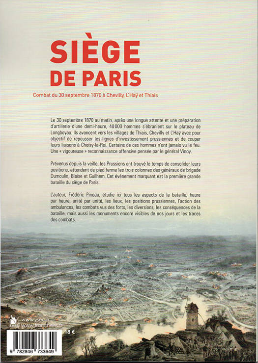 30 septembre 1870 au matin, après une longue attente et une préparation d’artillerie d’une demi-heure, 40 000 hommes s’ébranlent sur le plateau de Longboyau. Ils avancent vers les villages de Thiais, Chevilly et L’Haÿ avec pour objectif de repousser les lignes d’investissement prussiennes et de couper leurs liaisons à Choisy-le-Roi. Certains de ces hommes n’ont jamais vu le feu. Une « vigoureuse » reconnaissance offensive pensée par le général Vinoy. Prévenus depuis la veille, les Prussiens ont trouvé le temps de consolider leurs positions, attendant de pied ferme les trois colonnes des généraux de brigade Dumoulin, Blaise et Guilhem. Cet événement marquant est la première grande bataille du siège de Paris. L’auteur, Frédéric Pineau, étudie ici tous les aspects de la bataille, heure par heure, unité par unité, les lieux, les positions prussiennes, l’action des ambulances, les combats vus des forts, les diversions, les conséquences de la bataille, mais aussi les monuments.