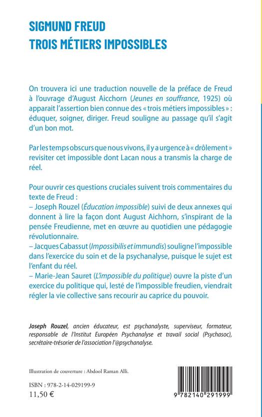 On trouvera ici une traduction nouvelle de la préface de Freud à l'ouvrage d'August Aicchorn (Jeunes en souffrance, 1925) où apparait l'assertion bien connue des trois métiers impossibles" éduquer, soigner, diriger. Freud souligne au passage qu'ils s'agit d'un bon mot. Par les temps obscurs que nous vivons, il y a urgence à "drôlement" revisiter cet impossible dont Lacan nous a transmis la charge réel. Pour ouvrir ces questions cruciales suivent trois commentaires du texte de Freud .