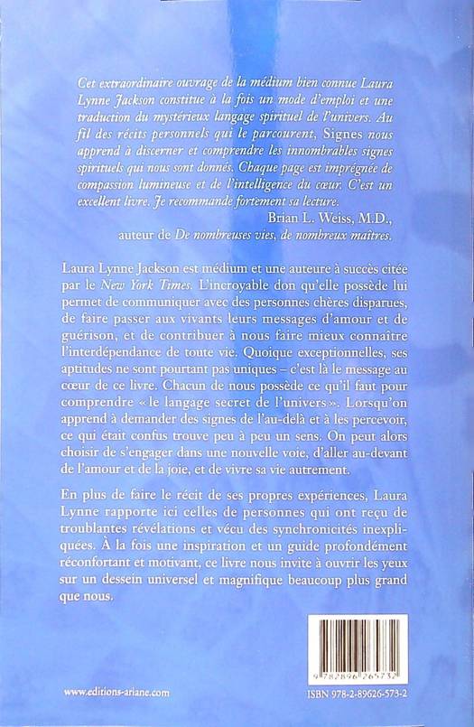 Laura Lynne Jackson est médium et une auteure à succès citée par le New York Times. L’incroyable don qu’elle possède lui permet de communiquer avec des personnes chères disparues, de faire passer aux vivants leurs messages d’amour et de guérison, et de contribuer à nous faire mieux connaître l’interdépendance de toute vie. Chacun de nous possède ce qu’il faut pour comprendre «?le langage secret de l’univers?». Lorsqu’on apprend à demander des signes de l’au-delà et à les percevoir, ce qui était confus trouve peu à peu un sens. On peut alors choisir de s’engager dans une nouvelle voie, d’aller au-devant de l’amour et de la joie, et de vivre sa vie autrement. En plus de faire le récit de ses propres expériences, Laura Lynne rapporte ici celles de personnes qui ont reçu de troublantes révélations et vécu des synchronicités inexpliquées. À la fois une inspiration et un guide profondément réconfortant et motivant, ce livre nous invite à ouvrir les yeux sur un dessein universel et magnifique beaucoup plus grand que nous.