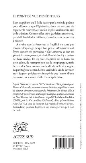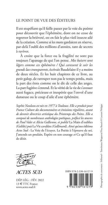 Il est stupéfiant qu'il faille passer par la voie du poème pour découvrir que l'éphémère, dont on ne cesse de regretter la brièveté, est en fait le plus vieil insecte ailé de la création. Comme si les mots gardaient en réserve, par-delà l'oubli des millions d'années, tant de secrets à raviver. À croire que la force ou la fragilité ne sont pas toujours l'apanage de qui l'on pense. Mes baisers sont légers comme ces éphémères / Qui caressent le soir les grands lacs transparents, écrivait Baudelaire il y a moins de deux siècles. Et les huit chapitres de ce livre, au petit galop, de rattraper non pas le temps perdu, mais la part des êtres comme on le dit de celle des anges. La part fugitive s'entend. Et la vérité de la vie de s'avouer aussi fugace, précieuse et inespérée que l'envol d'une danseuse ou le coup d'aile d'une éphémère.