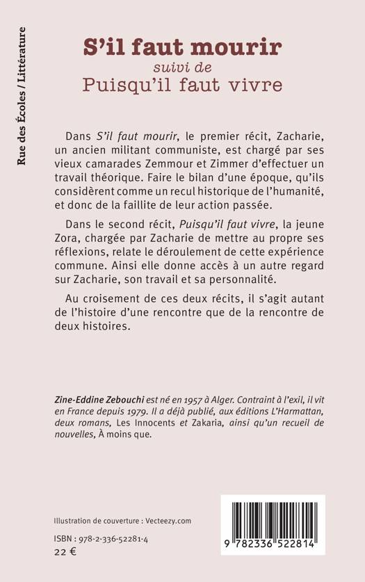Dans S'il faut mourir, le premier récit, Zacharie, un ancien militant communiste, est chargé par ses vieux camarades Zemmour et Zimmer d'effectuer un travail théorique. Faire le bilan d'une époque, qu'ils considèrent comme un recul historique de l'humanité, et donc de la faillite de leur action passée. Dans le second récit, Puisqu'il faut vivre, la jeune Zora, chargée par Zacharie de mettre au propre ses réflexions, relate le déroulement de cette expérience commune. Ainsi elle donne accès à un autre regard sur Zacharie, son travail et sa personnalité. Au croisement de ces deux récits, il s'agit autant de l'histoire d'une rencontre que de la rencontre de deux histoires.