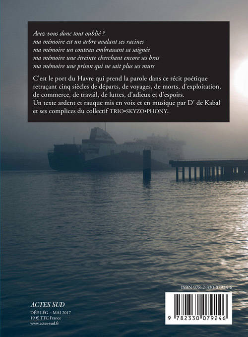 C'est le port du Havre qui prend la parole dans ce somptueux texte rauque, enflammé et engagé, qui retrace cinq siècles de départs, de voyages, de morts, d'exploitation, de commerce, de travail, de luttes, d'adieux et d'espoirs. Ce poème-fleuve en vers libres est mis en voix et en musique par le rappeur et slameur D' de Kabal et ses complices du groupe Trio°Skyzo°Phony.
