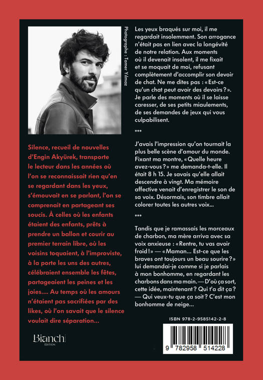 Silence, premier recueil de nouvelles d'Engin Akyürek, transporte le lecteur dans un temps passé où l'on se reconnaissait en se regardant dans les yeux, où l'on pouvait être ému en se parlant, où l'on se comprenait en partageant ses soucis. Un temps où les enfants étaient des enfants, prêts à prendre un ballon et courir au premier terrain libre, où les voisins toquaient, à l'improviste, à la porte des uns et des autres, célébraient ensemble les fêtes, partageaient les peines et les joies... Un temps où les amours n'étaient pas conditionnées aux "likes", où l'on savait que le silence pouvait signifier la séparation. Tout au long de ce recueil, les chats d'Istanbul manifestent leur présence.