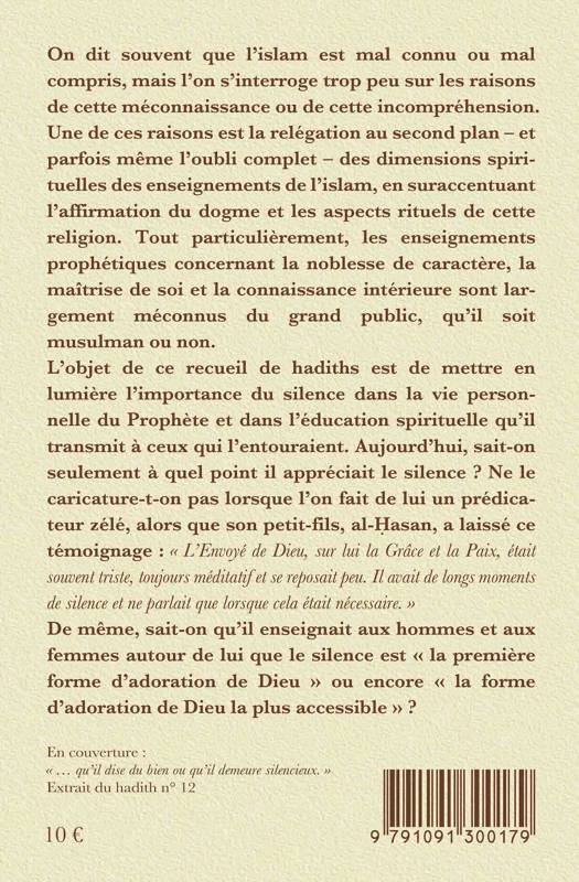 On dit souvent que l’islam est mal connu ou mal compris, mais l’on s’interroge trop peu sur les raisons de cette méconnaissance ou de cette incompréhension. Une de ces raisons est la relégation au second plan – et parfois même l’oubli complet – des dimensions spirituelles des enseignements de l’islam, en suraccentuant l’affirmation du dogme et les aspects rituels de cette religion. Tout particulièrement, les enseignements prophétiques concernant la noblesse de caractère, la maîtrise de soi et la connaissance intérieure sont largement méconnus du grand public, qu’il soit musulman ou non. L’objet de ce recueil de hadiths est de mettre en lumière l’importance du silence dans la vie personnelle du Prophète et dans l’éducation spirituelle qu’il transmit à ceux qui l’entouraient. Aujourd’hui, sait-on seulement à quel point il appréciait le silence ? Ne le caricature-t-on pas lorsque l’on fait de lui un prédicateur zélé, alors que son petit-fils, al-Ḥasan, a laissé ce témoignage : « L’Envoyé de Dieu, sur lui la Grâce et la Paix, était souvent triste, toujours méditatif et se reposait peu. Il avait de longs moments de silence et ne parlait que lorsque cela était nécessaire. » De même, sait-on qu’il enseignait aux hommes et aux femmes autour de lui que le silence est « la première forme d’adoration de Dieu » ou encore « la forme d’adoration de Dieu la plus accessible » ?