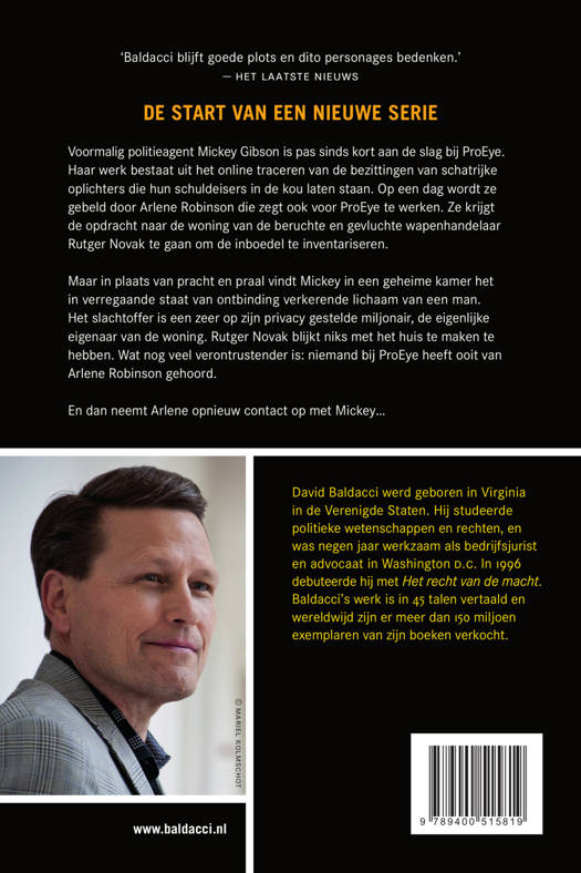 Maar in plaats van pracht en praal vindt Mickey in een geheime kamer het in verregaande staat van ontbinding verkerende lichaam van een man. Het slachtoffer is niet Rutger Novak, wiens huis het ook helemaal niet blijkt te zijn, maar een zeer op zijn privacy gestelde miljonair. En wat nog veel verontrustender is: niemand bij ProEye heeft ooit van Mickeys opdrachtgever Arlene Robinson gehoord.