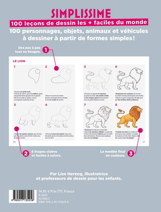 100 pas à pas pour apprendre à dessiner des animaux, réels ou imaginaires, des personnages issus des contes de fée, des dinosaures, des véhicules, des arbres, des fleurs et même des licornes…! Par Lise Herzog, illustratrice et professeur de dessin pour les enfants.
