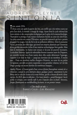 Terre, année 2354.Deux cents ans après la guerre des Ires, un conflit qui a lui-même couru sur près d’un siècle, le monde a changé de visage. Ayant brisé le cycle infernal des luttes armées et des catastrophes écologiques par la grâce de la nanotechnologie, l’humanité se protège d’une nature résolument hostile au cœur de cités-États. Les plus avancées ont connu l’Élévation, un procédé nanotech qui leur a permis de gagner les nuages, loin du Sol et de ses pollutions délétères. Dont la puissante Venise, pionnière des villes-tiges, qui étend son emprise planétaire par l’entremise de ses guildes ancestrales riches d’une maîtrise technologique bien gardée. Mais dans la Sérénissime, les haines sont tenaces et les jeux de pouvoir incessants. La séculaire Sintonia, lignée de redoutables femmes assassins usant du Diapason, un contrôle mental issu d’une nanite dont elles seules détiennent l’apanage, s’apprête à en faire les frais — jusqu’aux dernières de ses membres. À moins que… Dans ses sombres ruelles chargées d’histoire, au cœur de ses palais vertigineux, par-delà ses ponts suspendus et ses gondoles volantes, la Cité des Doges protège ses secrets derrière de nombreux masques…