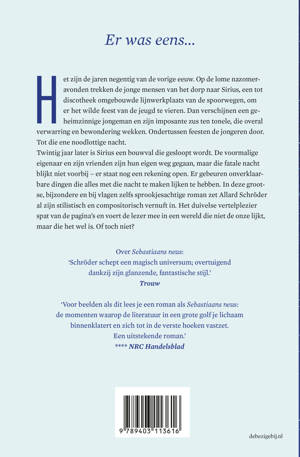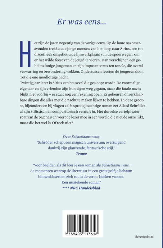 ‘Er was eens...’ Het zijn de jaren negentig van de vorige eeuw. Op de lome nazomeravonden trekken de jonge mensen van het dorp naar Sirius, een tot discotheek omgebouwde lijnwerkplaats van de spoorwegen, om er het wilde feest van de jeugd te vieren. Dan verschijnen een geheimzinnige jongeman en zijn imposante zus ten tonele, die overal verwarring en bewondering wekken. Ondertussen feesten de jongeren door. Tot die ene noodlottige nacht. Twintig jaar later is Sirius een bouwval die gesloopt wordt. De voormalige eigenaar en zijn vrienden zijn hun eigen weg gegaan, maar die fatale nacht blijkt niet voorbij – er staat nog een rekening open. Er gebeuren onverklaarbare dingen die alles met die nacht te maken lijken te hebben. In deze grootse, bijzondere en bij vlagen zelfs sprookjesachtige roman zet Allard Schröder al zijn stilistisch en compositorisch vernuft in. Het duivelse vertelplezier spat van de pagina’s en voert de lezer mee in een wereld die niet de onze lijkt, maar die het wel is. Of toch niet?