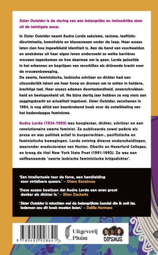 De zwarte, feministische, lesbische schrijver en dichter had een uitzonderlijk talent om haar hoop en dromen om te zetten in heldere, krachtige taal. Haar essays ademen doortastendheid, onverschrokkenheid en bevlogenheid uit. Na bijna dertig jaar hebben ze nog niets aan zeggingskracht en actualiteit ingeboet. Sister Outsider, verschenen in 1984, is nog altijd een baanbrekend boek voor de ontwikkeling van het hedendaagse feminisme.