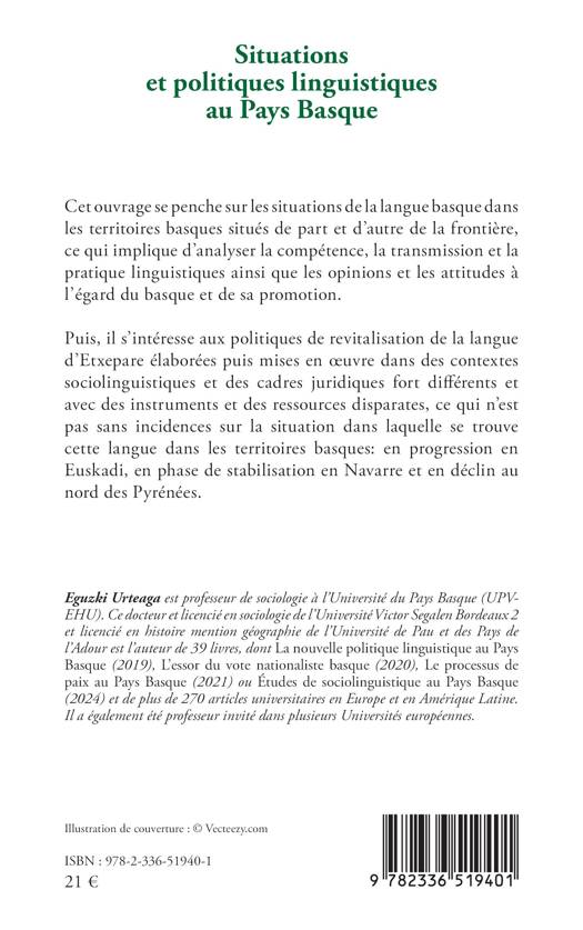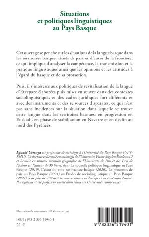Cet ouvrage se penche sur les situations de la langue basque dans les territoires basques situés de part et d'autre de la frontière, ce qui implique d'analyser la compétence, la transmission et la pratique linguistiques ainsi que les opinions et les attitudes à l'égard du basque et de sa promotion. Puis, il s'intéresse aux politiques de revitalisation de la langue d'Etxepare élaborées puis mises en oeuvre dans des contextes sociolinguistiques et des cadres juridiques forts différents et avec des instruments et des ressources disparates, ce qui n'est pas sans incidences sur la situation dans laquelle se trouve cette langue dans les territoires basques: en progression en Euskadi, en phase de stabilisation en Navarre et en déclin au nord des Pyrénées.