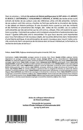 Six auteurs de théorie politique pour le XXIe siècle : H. Arendt, N. Busch, C.Castoriadis, C. Guillaumin, R. Ikevic, A. Sayad. Des textes et de courts extraits de textes de ces auteurs ont été présentés par des personnes qui les ont connus, côtoyés. En quoi leurs oeuvres sont importantes pour faire découvrir de nouveaux objets, de nouvelles démarches, pour obtenir une posture de résistance dans le travail intellectuel, la formation, la recherche ?