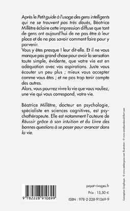 Après le «Petit guide à l'usage des gens intelligents qui ne se trouvent pas très doués», Béatrice Millêtre éclaire cette impression diffuse que tant de gens ont aujourd'hui de ne pas être à leur place et de ne pas savoir comment faire pour y arriver. Vous y êtes presque ! leur dit-elle. Et il ne vous manque pas grand-chose pour avoir la sensation toute simple, évidente, que votre vie est en adéquation avec vos aspirations. Juste vous écouter un peu plus ; mieux vous accepter comme vous êtes ; et ne pas trop tenir compte des autres. Alors, vous pourrez vivre la vie que vous vouliez, une vie qui vous correspond, votre vie.