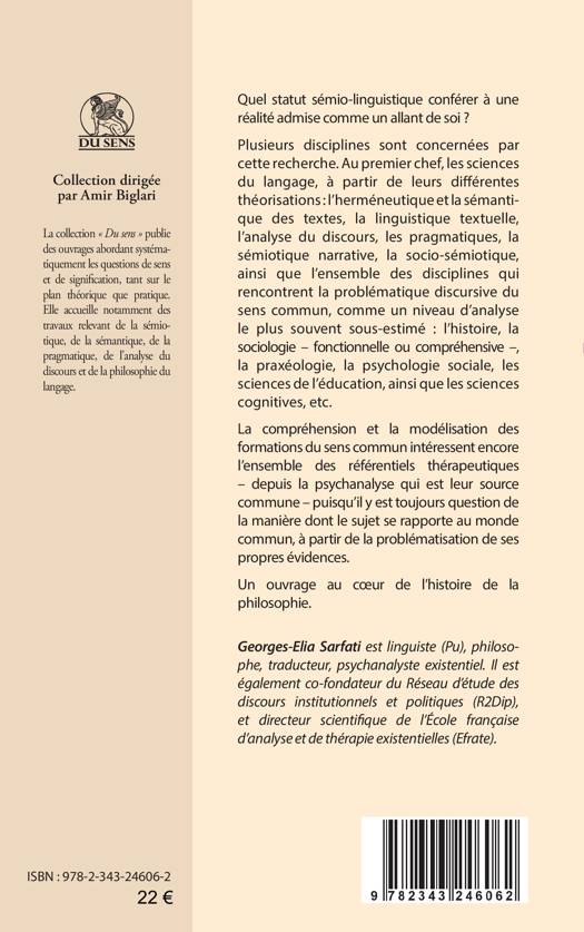 Quel statut sémio-linguistique conférer à une réalité admise comme un allant de soi ? Plusieurs disciplines sont concernées par cette recherche. Au premier chef, les sciences du langage, à partir de leurs différentes théorisations : l’herméneutique et la sémantique des textes, la linguistique textuelle, l’analyse du discours, les pragmatiques, la sémiotique narrative, la socio-sémiotique, ainsi que l’ensemble des disciplines qui rencontrent la problématique discursive du sens commun, comme un niveau d’analyse le plus souvent sous-estimé : l’histoire, la sociologie, la praxéologie, la psychologie sociale, les sciences de l’éducation, ainsi que les sciences cognitives, etc. La compréhension et la modélisation des formations du sens commun intéressent encore l’ensemble des référentiels thérapeutiques (depuis la psychanalyse) puisqu’il y est toujours question de la manière dont le sujet se rapporte au monde commun, à partir de la problématisation de ses propres évidences.