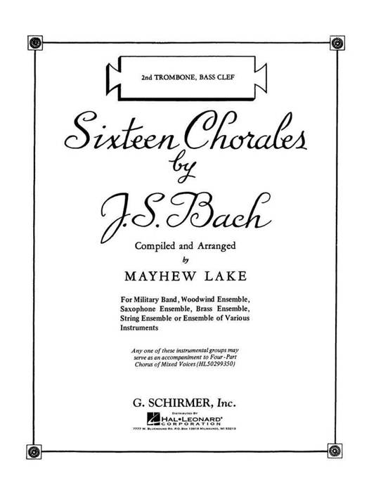 (G. Schirmer Band/Orchestra). Transcribed by Mayhew Lake, these arrangements follow carefully the original Bach harmonizations and include valuable tips for ensemble balance when performing with SATB chorus (HL50299350). Available parts allow for performance by by concert band, woodwind ensemble, brass ensemble, string ensemble, saxophone ensemble, and groups with flexible/limited instrumentation. Contents: 1. Wie schon leuchtet der Morgenstern 2. Gieb, dass ich tu mit Fleiss 3. Ach wie fluchtig 4. Ach Gott, wie manches Herzeleid 5. Jesu, nimm dich deiner Glieder 6. All' solch dein Gut' wir preisen 7. Es ist genug; so nimm, Herr, meinen Geist 8. Es ist das Heil uns kommen her 9. Auf meinen lieben Gott 10. Mache dich, mein Geist, bereit 11. Jesu, der du meine Seele 12. Du Lebensfurst, Herr Jesu Christ 13. Alleluia, dess soll'n wir Alle froh sein 14. Erhalt uns in der Wahrheit 15. Ei nun, mein Gott, so fall' ich dir 16. Wachet auf, ruft uns die Stimme