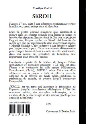 Kasper, 17 ans, suite à une déception sentimentale et une humiliation, prend refuge dans sa chambre. Dans sa grotte, comme n’importe quel adolescent, il plonge dans les réseaux sociaux pour passer le temps et trouver des réponses. Emporté par le flux que lui propose l’algorithme, Kasper tombe sur Skroll. Adolescente du même âge que lui, représentante d’un mouvement baptisé « Marche blanche », elle s’adresse à une jeunesse rongée par l’angoisse et la peur. Cette rencontre est déterminante pour Kasper, trouvant dans les mots de cette adolescente, dans son écoute, un réconfort, de l’attention, une importance mais aussi de l’amour. Construite à partir de la citation de Jacques Pilhan (publicitaire et conseillé politique) « Le réel est dans l’écran » et structurée en trois temps (Glissement, Basculement, Chute), Skroll relate l’itinéraire d’un adolescent où sa propre « bulle de filtre » , nouvelle allégorie de la caverne du XXI siècle, modifiera sa perception du monde, sa pensée, jusqu’à commettre l’irréparable. Skroll est un texte qui interroge la fabrication de l’opinion jusqu’au basculement idéologique, à l’ère des nouveaux médias, des nouvelles technologies, de la création de la pensée unique et des actions qu’elle génère contre la démocratie.