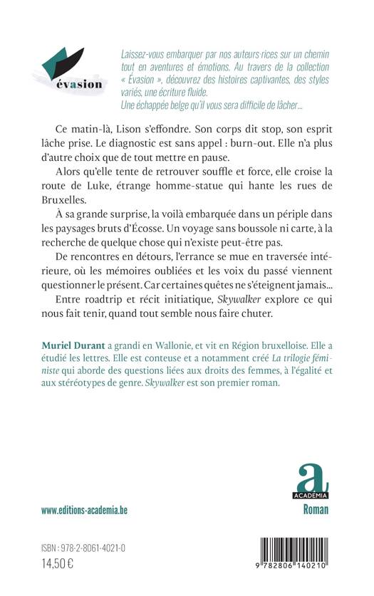 Ce matin-là, Lison s'effondre. Son corps dit stop, son esprit lâche prise. Le diagnostic est sans appel: burn-out. Elle n'a plus d'autre choix que de tout mettre en pause. Alors qu'elle tente de retrouver souffle et force, elle croise la route de Luke, étrange homme-statue qui hante les rues de Bruxelles. À sa grande surprise, la voilà embarquée dans un périple dans les paysages bruts d'Écosse. Un voyage sans boussole ni carte, à la recherche de quelque chose qui n'existe peut-être pas. De rencontres en détours, l'errance se mue en traversée intérieure, où les mémoires oubliées et les voix du passé viennent questionner le présent. Car certaines quêtes ne s'éteignent jamais... Entre roadtrip et récit initiatique, Skywalker explore ce qui nous fait tenir, quand tout semble nous faire chuter.