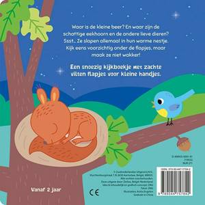 Waar is de kleine beer? En waar zijn de schattige eekhoorn en de andere lieve dieren? Ssst… Ze slapen allemaal in hun warme nestje. Kijk eens voorzichtig onder de flapjes, maar maak ze niet wakker! Een snoezig kijkboekje met zachte vilten flapjes voor kleine handjes. Voor kinderen vanaf 2 jaar