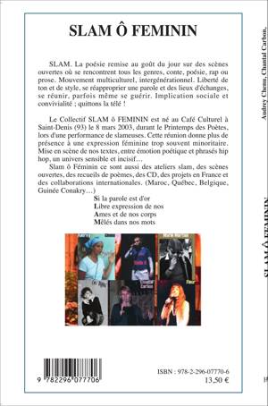 SLAM. La poésie remise au goût du jour sur des scènes ouvertes, où se rencontrent tous les genres, conte, poésie, rap ou prose. Mouvement multiculturel, intergénérationnel. Liberté de ton et de style. Implication sociale et convivialité. Le Collectif SLAM ô FEMININ est né au Café Culturel à Saint-Denis (93), le 8 mars 2003, durant le Printemps des Poètes, lors d'une performance de slameuses. Slam ô Féminin, ce sont aussi des collaborations internationales : Maroc, Québec, Belgique, Guinée Conakry... Si la parole est d'or / Libre expression de nos / Âmes et de nos corps / Mêlés dans nos mots.