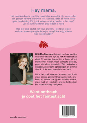 Hey mama, Het moederschap is prachtig, maar laten we eerlijk zijn: soms is het ook gewoon keihard overleven. Het is chaos, liefde én heeft totaal geen handleiding. Zit jij ook weleens met je handen in het haar? Dan is Slim moederen jouw redder in nood. Hoe leer je je peuter zijn neus snuiten? Hoe tover je een verloren speen op magische wijze terug? Hoe krijg je twee kids in één buggy? Britt Muyldermans, bekend van haar eerlijke en humoristische kijk op het moederschap deelt 52 geniale hacks die je leven direct makkelijker maken. Geen perfecte plaatjes, geen eindeloze theorieën. Wel herkenbare situaties, praktische oplossingen en slimme tips & tricks waar je nu iets aan hebt. Dit is het boek waarvan je denkt: had ik dit maar eerder gelezen! Dus blader, lach, probeer, en ervaar hoe jij met minder moeite, meer rust en (eindelijk) warme koffie door het moederschap navigeert. Want onthoud: je doet het fantastisch!