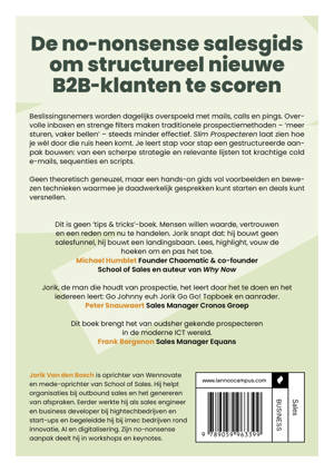'Dit is geen 'tips & tricks'-boek. Mensen willen waarde, vertrouwen en een reden om nu te handelen. Jorik snapt dat: hij bouwt geen salesfunnel, hij bouwt een landingsbaan. Lees, highlight, vouw de hoeken om en pas het toe.' - Michael Humblet Founder Chaomatic & co-founder School of Sales en auteur van Why Now 'Jorik, de man die houdt van prospectie, het leert door het te doen en het iedereen leert: Go Johnny euh Jorik Go Go! Topboek en aanrader.' - Peter Snauwaert Sales Manager Cronos Groep 'Dit boek brengt het van oudsher gekende prospecteren in de moderne ICT wereld.' - Frank Borgenon Sales Manager Equans