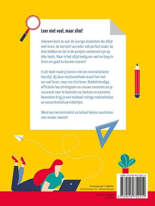 Leer niet veel, maar slim! Iedereen kent ze wel: de ijverige studenten die altijd veel leren, de leerstof van ieder vak perfect onder de knie hebben en tot in de puntjes voorbereid zijn op elke toets. Maar is het altijd nodig om veel en lang te leren om goed te kunnen scoren? In dit boek maak je kennis met de minimalistische leerstijl. Bij deze studiemethode draait het niet om veel leren, maar om slim leren. Ontdek handige, efficiënte leerstrategieën en nieuwe manieren om je succesvol voor te bereiden op toetsen en examens. Bovendien krijg je een heleboel nuttige motivatietips en concentratiehulpmiddeltjes. Word een leerminimalist en behaal betere resultaten met minder moeite!