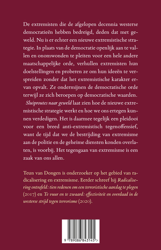 De extremisten die de afgelopen decennia westerse democratieën hebben bedreigd, deden dat met geweld. Nu is er echter een nieuwe extremistische strategie. In plaats van de democratie openlijk aan te vallen en onomwonden te pleiten voor een hele andere maatschappelijke orde, verhullen extremisten hun doelstellingen en proberen ze om hun ideeën te verspreiden zonder dat het extremistische karakter ervan opvalt. Ze ondermijnen de democratische orde terwijl ze zich beroepen op democratische waarden. Sluiproutes naar geweld laat zien hoe de nieuwe extremistische strategie werkt en hoe we ons ertegen kunnen verdedigen. Het is daarmee tegelijk een pleidooi voor een breed anti-extremistisch tegenoffensief, want de tijd dat we de bestrijding van extremisme aan de politie en de geheime diensten konden overlaten, is voorbij. Het tegengaan van extremisme is een zaak van ons allen.