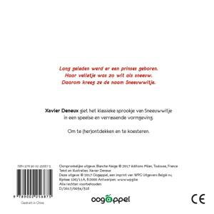 Lang geleden werd er een prinses geboren. Haar velletje was zo wit als sneeuw. Daarom kreeg ze de naam Sneeuwwitje. Xavier Deneux giet het klassieke sprookje van Sneeuwwitje in een speelse en verrassende vormgeving. Om te (her)ontdekken en te koesteren.