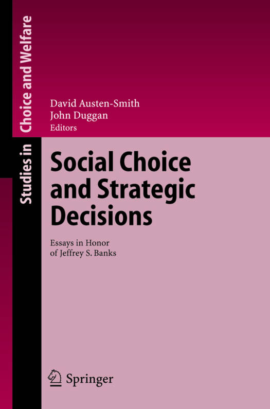 A collection of essays that ties together the fields spanned by Jeffrey S. Banks' research on social choice and strategic decisions. It examines the strategic aspects of political decision-making, including the choices of voters in committees, the positioning of candidates in electoral campaigns, and the behavior of parties in legislatures. The essays employ a spectrum of research methods, from game-theoretic analysis to empirical investigation and experimental testing.