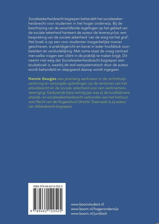Socialezekerheidsrecht begrepen behandelt het socialezekerheidsrecht voor studenten in het hoger onderwijs. Bij de beschrijving van de verschillende regelingen op het gebied van de sociale zekerheid hanteert de auteur de levenscyclus: een bespreking van de sociale zekerheid ‘van de wieg tot het graf’. Het boek is op een voor studenten toegankelijke manier geschreven, is praktijkgericht en bevat in ieder hoofdstuk voorbeelden ter verduidelijking. Met name staat de vraag centraal met welke vragen een cliënt in de praktijk te maken krijgt. Dit neemt niet weg dat Socialezekerheidsrecht begrepen een studieboek is, waarbij de stof wetsystematisch door de auteur wordt behandeld en diepgaand daarop wordt ingegaan. Hannie Geugjes was jarenlang werkzaam in de rechtshulpverlening en verzorgde opleidingen op de terreinen van het arbeidsrecht en de sociale zekerheid voor een werknemersvereniging. Gedurende bijna twintig jaar was zij als hoofddocent arbeids- en socialezekerheidsrecht verbonden aan het Instituut voor Recht van de Hogeschool Utrecht. Daarnaast is zij auteur van Arbeidsrecht begrepen.