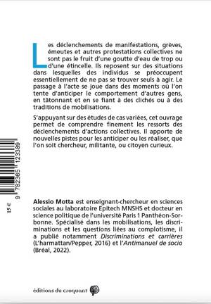 Les déclenchements de manifestations, grèves et autres protestations collectives ne sont pas le fruit d’une goutte d’eau de trop ou d’une étincelle. Ils reposent sur des ituations dans lesquelles des individus, quelles que soient leurs motivations initiales, se préoccupent essentiellement de ne pas se trouver seuls à agir. Les interactions où se joue le passage à l’action sont marquées par de nombreuses tentatives d’anticipation des comportements d’autres personnes, basées sur des tâtonnements et sur la reconnaissance de clichés ou traditions de mobilisations. S’appuyant sur plusieurs études de cas et construisant un cadre théorique dérivé des traditions interactionniste et<br /> constructiviste, cet ouvrage permet de comprendre finement les ressorts des déclenchements d’actions collectives. Il apporte aussi de nouvelles pistes pour les anticiper ou les réaliser, que l’on soit chercheur ou militant.