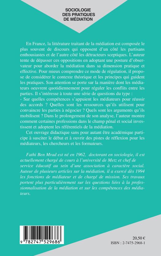En France, la littérature traitant de la médiation est composée le plus souvent de discours qui opposent d'un côté les partisans enthousiastes et de l'autre côté les détracteurs sceptiques. L'auteur tente de dépasser ces oppositions en adoptant une posture d'observation pour aborder la médiation dans sa dimension pratique et effective. Pour mieux comprendre ce mode de régulation, il propose de considérer le contexte théorique et les principes qui guident les pratiques. Son attention se porte sur la manière dont les médiateurs uvrent quotidiennement pour réguler les conflits entre les parties. Cet ouvrage didactique participe à ouvrir des pistes de réflexion pour les médiateurs, les chercheurs et les formateurs.