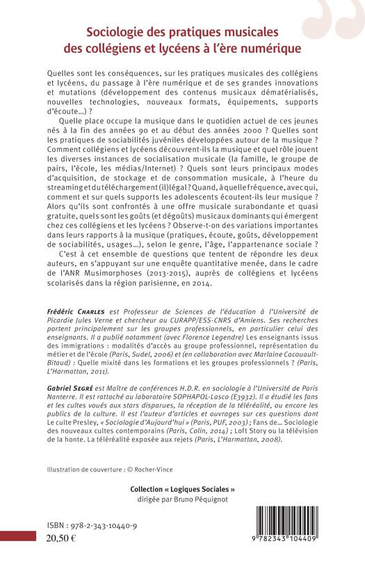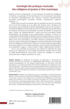 Quelles sont les conséquences, sur les pratiques musicales des collégiens et lycéens, du passage à l'ère numérique et de ses grandes innovations et mutations (développement des contenus musicaux dématérialisés, nouvelles technologies, nouveaux formats, équipements, supports d'écoute...) ? Comment collégiens et lycéens découvrent-ils la musique et quel rôle jouent les diverses instances de socialisation musicale ? (la famille, le groupe de pairs, l'école, les médias/internet) ? Quels sont leurs principaux modes d'acquisition, de stockage et de consommation musicale, à l'heure du streaming et du téléchargement (il)légal ?