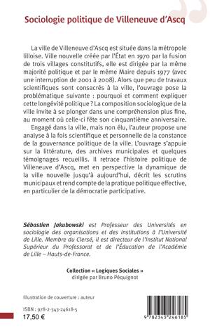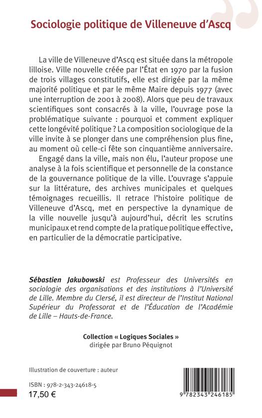 La ville de Villeneuve d’Ascq est située dans la métropole lilloise. Ville nouvelle créée par l’État en 1970 par la fusion de trois villages constitutifs, elle est dirigée par la même majorité politique et par le même Maire depuis 1977 (avec une interruption de 2001 à 2008). Alors que peu de travaux scientifiques sont consacrés à la ville, l’ouvrage pose la problématique suivante : pourquoi et comment expliquer cette longévité politique ? Engagé dans la ville, mais non élu, l’auteur propose une analyse à la fois scientifique et personnelle de la constance de la gouvernance politique de la ville. Il retrace l’histoire politique de Villeneuve d’Ascq.