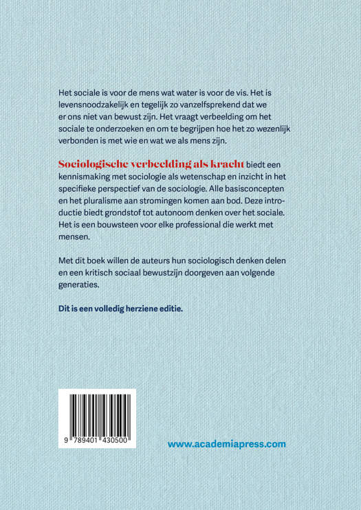 Het sociale is voor de mens wat water is voor de vis. Het is levensnoodzakelijk en tegelijk zo vanzelfsprekend dat we er ons niet van bewust zijn. Het vraagt verbeelding om het sociale te onderzoeken en om te begrijpen hoe het zo wezenlijk verbonden is met wie en wat we als mens zijn. Sociologische verbeelding als kracht biedt een kennismaking met sociologie als wetenschap en inzicht in het specifieke perspectief van de sociologie. Alle basisconcepten en het pluralisme aan stromingen komen aan bod. Deze introductie biedt grondstof tot autonoom denken over het sociale. Het is een bouwsteen voor elke professional die werkt met mensen. Met dit boek willen de auteurs hun sociologisch denken delen en een kritisch sociaal bewustzijn doorgeven aan volgende generaties. Dit is een volledig herziene editie.