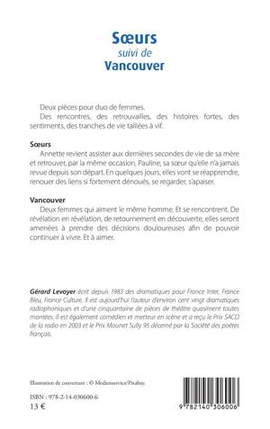 Deux pièces pour duo de femmes. Des rencontres, des retrouvailles, des histoires fortes, des sentiments, des tranches de vie taillées à vif. Surs Annette revient assister aux dernières secondes de vie de sa mère et retrouver, par la même occasion, Pauline, sa soeur qu'elle n'a jamais revue depuis son départ. En quelques jours, elles vont se réapprendre, renouer des liens si fortement dénoués, se regarder, s'apaiser. Vancouver Deux femmes qui aiment le même homme. Et se rencontrent. De révélation en révélation, de retournement en découverte, elles seront amenées à prendre des décisions douloureuses afin de pouvoir continuer à vivre. Et à aimer.