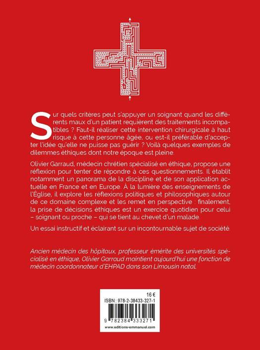 L’omniprésence de la question de l’euthanasie témoigne que l’éthique dans le soin est un sujet urgent. Alors que la morale qui a régi l’Occident durant plusieurs siècles est remise en question et que les législations bougent, le personnel soignant – notamment chrétien – a de moins en moins de repères. Quelle importance reste réservée à l’éthique des décisions prises, particulièrement dans la médecine ? Ces questionnements généraux se répercutent au niveau particulier : au chevet des malades, les dilemmes sont nombreux et quotidiens, alors que les praticiens qui doivent y faire face sont peu formés. Soigner, oui, mais comment ? jusqu’où ? Olivier Garraud, médecin spécialiste de la question de l’éthique, présente un panorama de cette discipline et donne au lecteur des outils de discernement dans le domaine. Chacun est confronté un jour où l’autre au choix à poser, que ce soit pour soi ou pour un proche.
