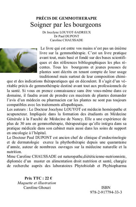 Ce livre n’est pas un énième livre sur la gemmothérapie. C’est un livre pratique avant tout, mais basé et fondé sur des bases scientifiques et des références bibliographiques les plus récentes. Tous les bourgeons et jeunes pousses de plantes sont décrits en tenant compte de leur usage traditionnel mais surtout de leur composition chimique et des indications thérapeutiques qui en découlent. Il s’agit d’un véritable précis de gemmothérapie destiné avant tout aux professionnels de la santé. Si vous en prenez connaissance sans être vous-même dans ce domaine, il faudra avant de prendre ces macérats de plantes demander l’avis d’un médecin ou pharmacien car les plantes ne sont pas toujours compatibles avec les traitements allopathiques.