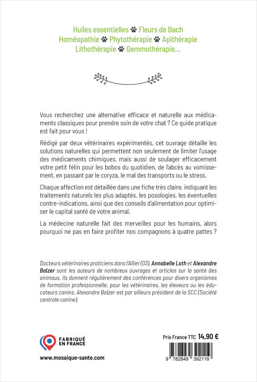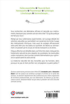 La médecine naturelle fait des merveilles pour les hommes, alors pourquoi ne pas en faire profiter nos compagnons à quatre pattes ? Rédigé par deux vétérinaires spécialistes, ce guide pratique détaille les solutions naturelles qui permettent non seulement de limiter l’usage des médicaments chimiques, mais aussi de soulager efficacement les animaux pour les petits bobos du quotidien. Ces médecines naturelles et énergétiques sont faciles à mettre en œuvre et tous les maîtres peuvent les tester. Les produits sont par ailleurs tous trouvables en magasin ou sur Internet. Plus de 30 troubles et maux courants présentés sous forme de fiches très claires et pratiques, classés par ordre alphabétique : abcès, allergie, coryza, coupure, FIV, stress, tartre, etc. Pour chaque pathologie : les causes, les symptômes, puis les différentes méthodes naturelles proposées, avec les dosages, les posologies et les contre-indications parfaitement détaillés.