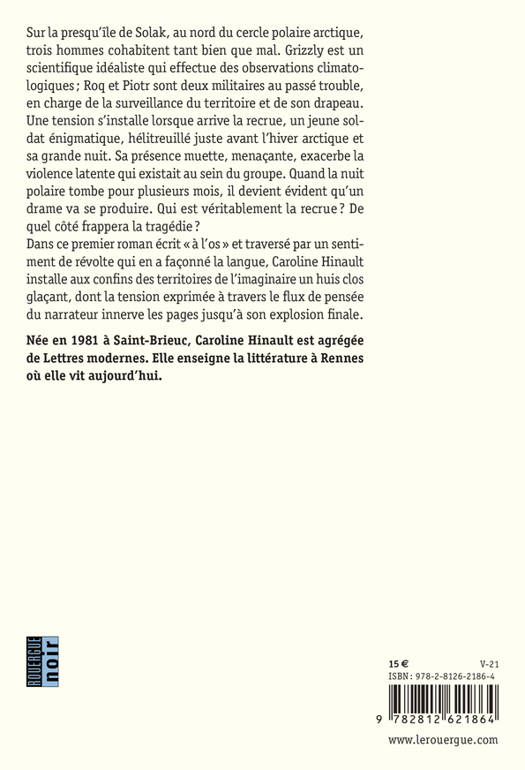 Sur la presqu'île de Solak, au nord du cercle polaire arctique, trois hommes cohabitent tant bien que mal. Grizzly est un scientifique idéaliste qui effectue des observations climatologiques ; Roq et Piotr sont deux militaires au passé trouble, en charge de la surveillance du territoire et de son drapeau. Une tension s'installe lorsqu'arrive la recrue, un jeune soldat énigmatique, hélitreuillé juste avant l'hiver arctique et sa grande nuit. Sa présence muette, menaçante, exacerbe la violence latente qui existait au sein du groupe. Quand la nuit polaire tombe pour plusieurs mois, il devient évident qu'un drame va se produire. Qui est véritablement la recrue ? De quel côté frappera la tragédie ? Dans ce premier roman écrit « à l'os », tout entier dans un sentiment de révolte qui en a façonné la langue, Caroline Hinault installe aux confins des territoires de l'imaginaire un huis clos glaçant, dont la tension exprimée à travers le flux de pensée du narrateur innerve les pages jusqu'à son explosion finale.