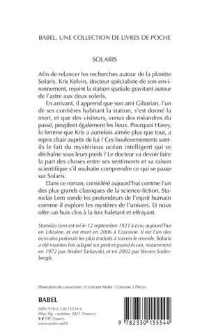 Afin de relancer les recherches autour de la planète Solaris, Kris Kelvin, docteur spécialiste de son environnement, rejoint la station spatiale gravitant autour de l'astre aux deux soleils. En arrivant, il apprend que son ami Gibarian, l'un de ses confrères habitant la station, s'est donné la mort, et que des visiteurs, venus des méandres du passé, peuplent également les lieux. Pourquoi Harey, la femme que Kris a autrefois aimée plus que tout, a repris chair auprès de lui ? Ces bouleversements sont-ils le fait du mystérieux océan intelligent qui se déchaîne sous leurs pieds ? Le docteur va devoir faire la part des choses entre ses sentiments et sa raison scientifique s'il souhaite comprendre ce qui se passe sur Solaris. Dans ce roman, considéré aujourd'hui comme l'un des plus grand classiques de la science-fiction, Stanislas Lem sonde les profondeurs de l'esprit humain comme il explore les mystères de l'univers. Et nous offre un huis clos à la fois haletant et effrayant.