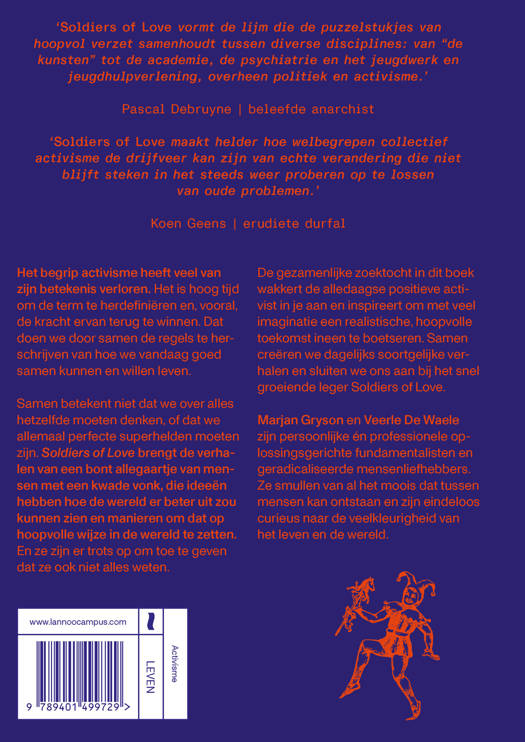 'Soldiers of Love vormt de lijm die de puzzelstukjes van hoopvol verzet samenhoudt tussen diverse disciplines: van "de kunsten" tot de academie, de psychiatrie en het jeugdwerk en jeugdhulpverlening, overheen politiek en activisme.' - Pascal Debruyne | beleefde anarchist 'Soldiers of Love maakt helder hoe welbegrepen collectief activisme de drijfveer kan zijn van echte verandering die niet blijft steken in het steeds weer proberen op te lossen van oude problemen.' -Koen Geens | erudiete durfal